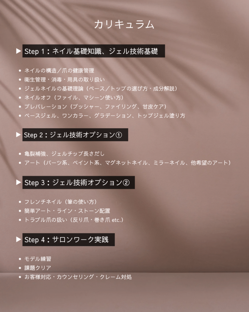 お客様からの需要が高く、サロンワークに直結する「ジェルネイル」に集中して学びます。